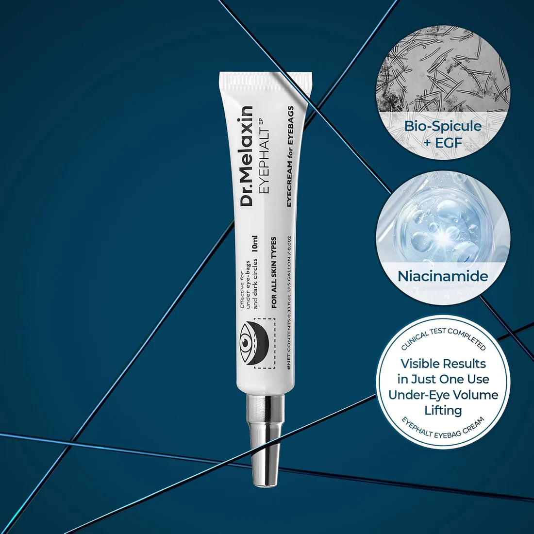 Dr.Melaxin Eyephalt Eyebag Cream (0.33 fl.oz.) is a skincare product designed to target common under-eye concerns such as puffiness, dark circles, and fine lines. It uses advanced ingredients to help revitalize the delicate skin around the eyes.