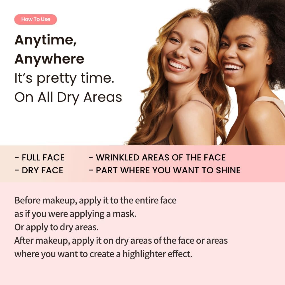 How to Use: At the last step of skin care, gently apply it to the face or dry areas. It can also be used before and after makeup. Just apply it to the areas that need luster and moisture to get a radiant look.